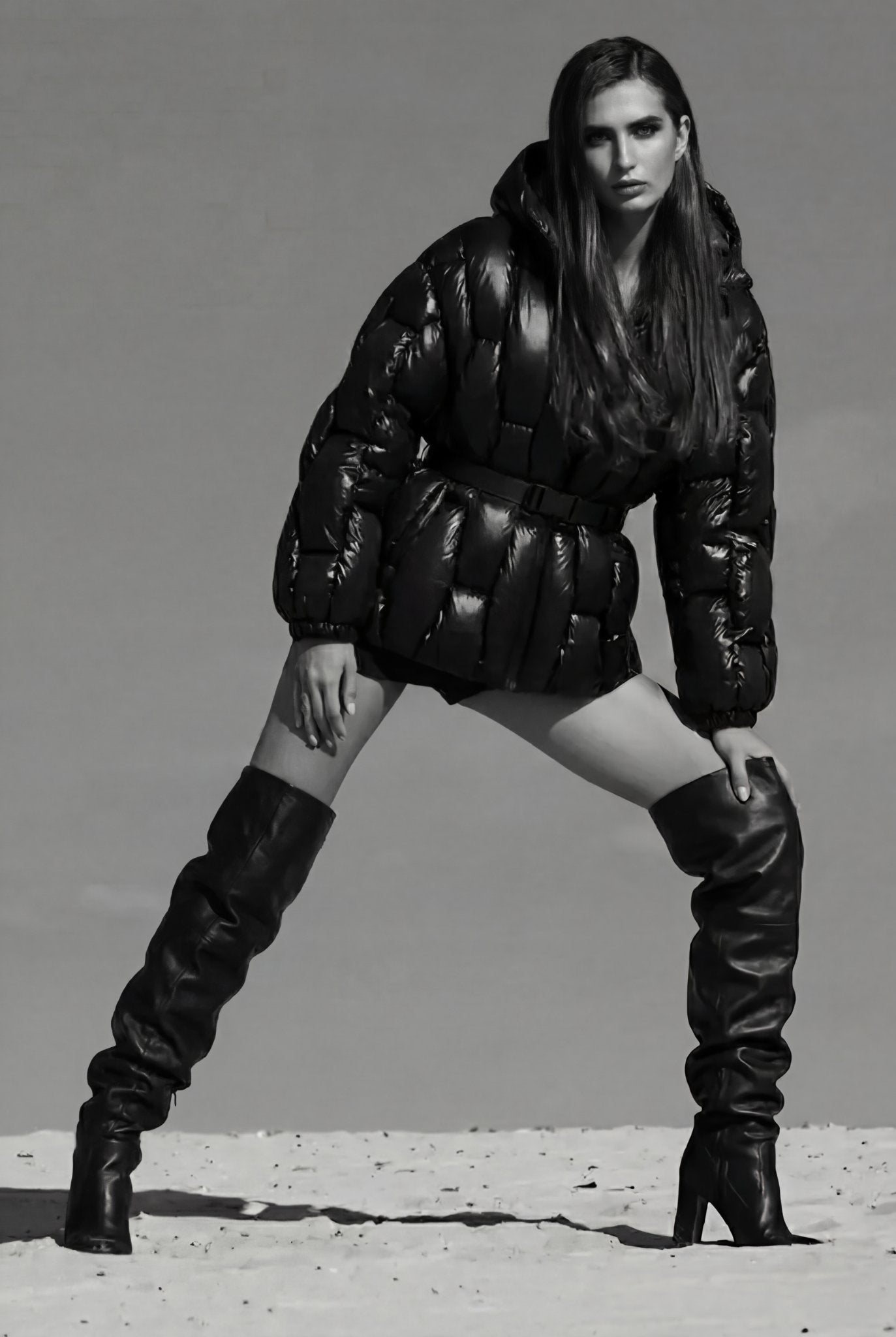 Belted Hooded Down Puffer Jacket in Lacquered Nylon