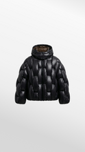 Oversized hooded puffer jacket crafted from technical nylon shell with premium cotton down fill, featuring exaggerated quilted baffles and adjustable hood. Cut to a relaxed, oversized silhouette with dropped shoulders, cropped length, and two-way zip front closure for contemporary streetwear-inspired warmth.